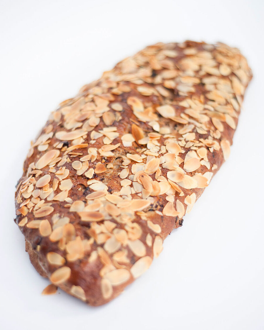 Feestelijk brood met amandelen, hazelnoten, krenten en rozijnen, gevuld met amandelspijs.